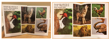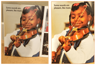 There are some advantages to this method: you can get really crisp, clear photos. You can edit out a few pages if the book is too long for your purposes. You completely control the timing. I like to engage my students in some books, asking questions like “can you see the duckling? where is it?” or “how many puppies do you see – can we count them together?” and that works better with these slide shows than it works to try to pause and un-pause a video for these interactions. The downside is that this method is more work than any other method! There is one important way you can speed up the work. Instead of using your phone camera to take the pictures, use a scanner app like Office Lens. It will save you a great deal of time! If you use your camera to take a picture of a page of a book, then you’ll have to crop the image to get rid of irrelevant background, and also the images tend to have a keystone effect, where the top of the page looks wider than the bottom of the page. Office Lens will fix keystoning and do the cropping for you. Below are samples of pictures I took with my regular camera vs. the pictures I took using Office Lens. Both were taken from the same angle with the same amount of time and effort (not much) put into snapping the picture. [Pictures from Sound by Trumbauer.]