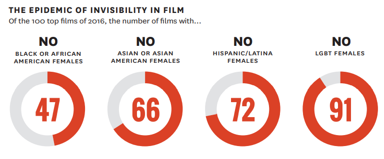 While women are generally under-represented in film, a particularly invisible population, as you can see on the right, is LGBT females, who did not appear in 91 of the top 100 films. (Source)